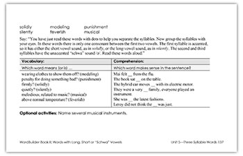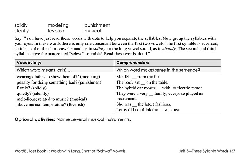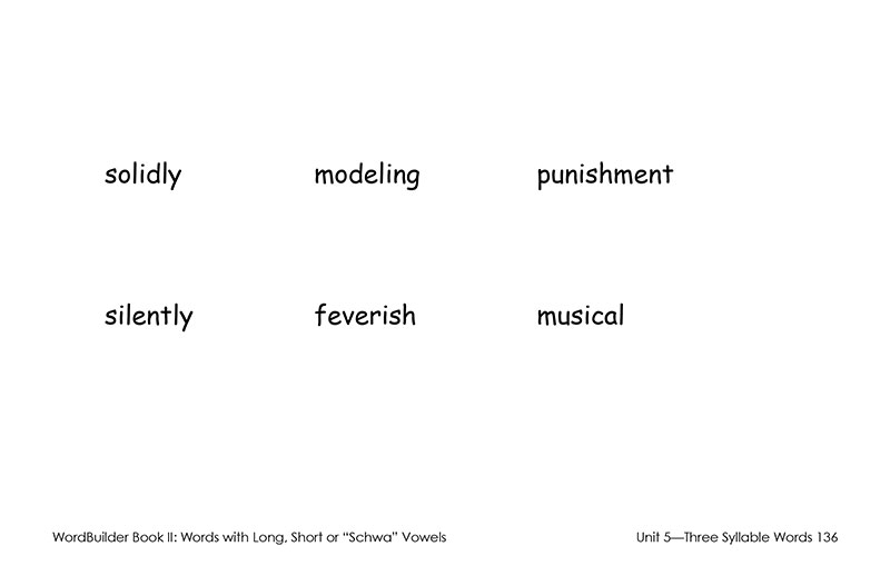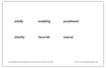 WordBuilder is for poor readers in third grade or beyond, who can read most one-syllable and two-syllable words. It reviews two-syllable words with specific phonic structures, and then teaches children to read the three-syllable words with that structure. Because of this built-in review, second or third graders who have not mastered reading two-syllable words with all structures can be included in groups using WordBuilder. Older poor readers, who often resent learning to sound out “baby” words, find WordBuilder a grown-up way to learn the skills they missed earlier. When students have successfully completed the WordBuilder books, if their listening comprehension skills are at the sixth- or seventh-grade level, they should be able to read successfully at a sixth- or seventh-grade level.